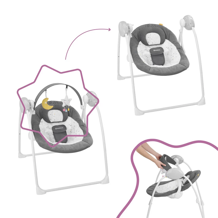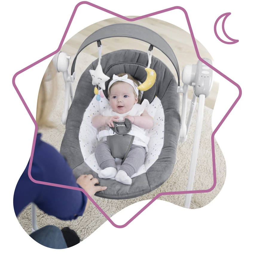 Que ce soit pour l’endormir, l’apaiser ou l’éveiller, vous trouvez le rythme et la position qui convient le mieux à votre enfant.