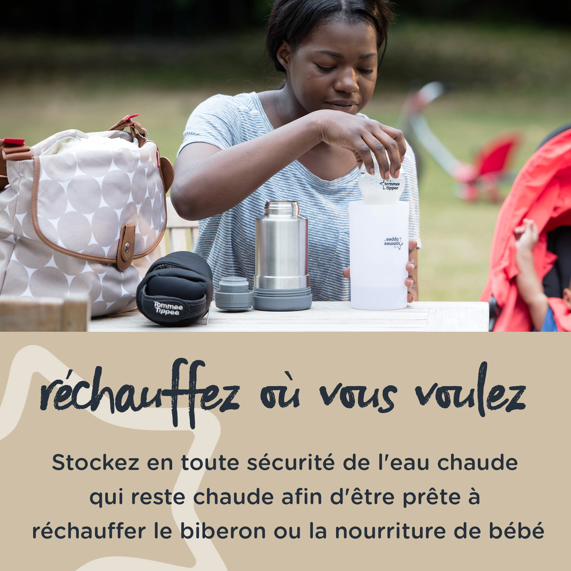 Le thermos réchauffe biberon est idéal pour partir en voyage car il permet de réchauffer plusieurs biberons dans la journée, où que vous soyez, sans électricité. Il garde l’eau à la bonne température pour la préparation des biberons et des petits pots. 2 en 1 , son couvercle sert aussi de récipient pour le réchauffage du biberon et son mécanisme d’ouverture/fermeture à bouton pression permet de doser le liquide plus facilement.