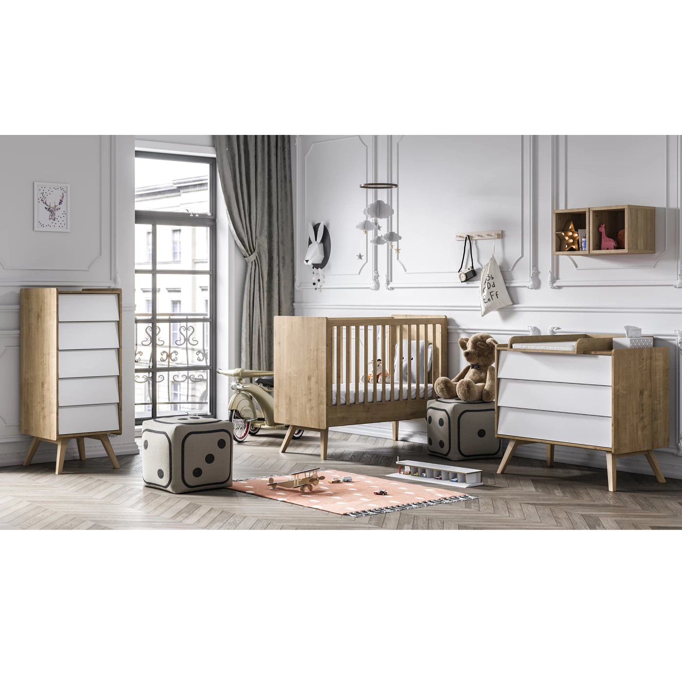 Chiffonier au look résolument rétro avec 5 grands tiroirs pour ranger toutes les affaires de votre enfant. Pratique et élégant, le chiffonier dispose de façades de couleur interchangeables.