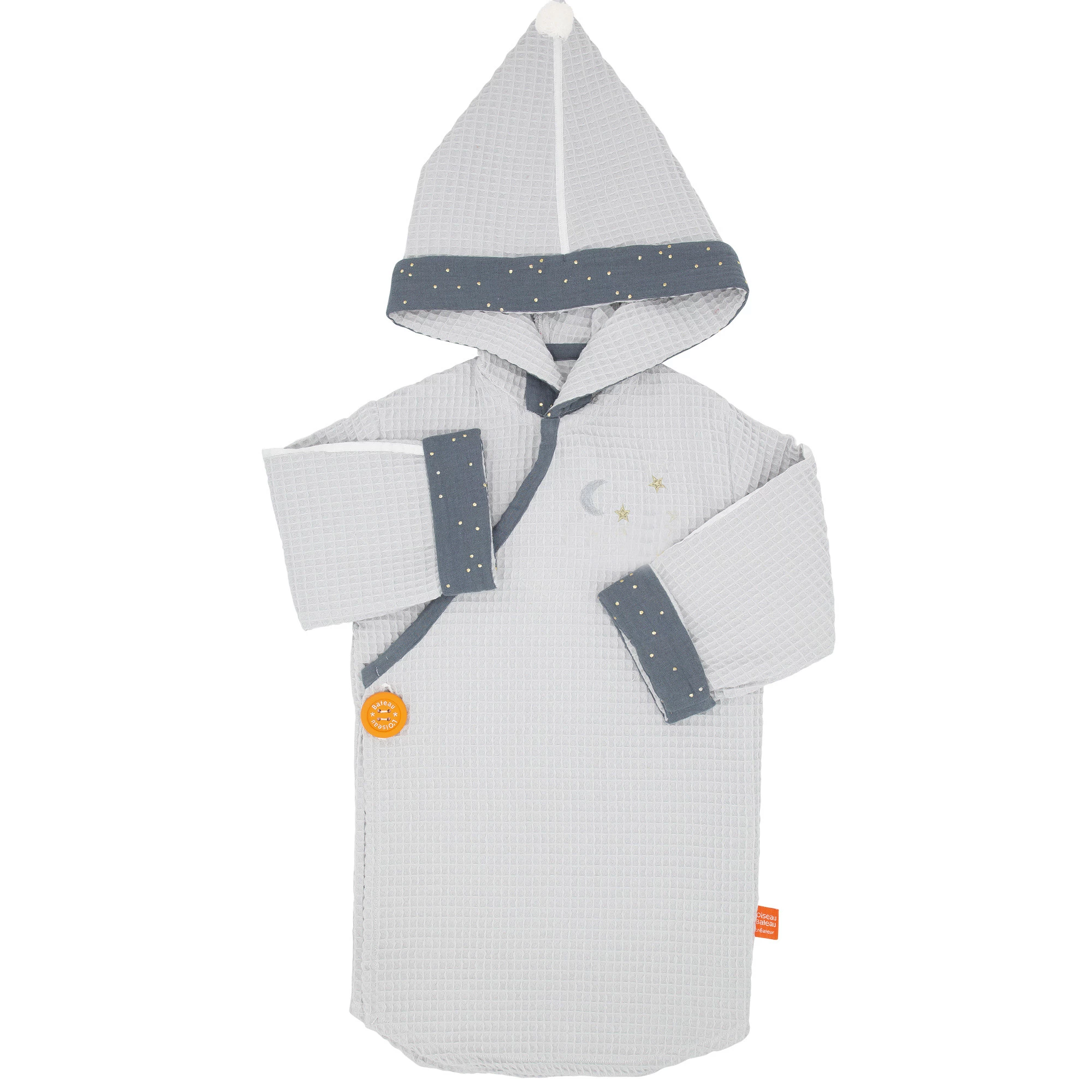 Kimono tout douillet en nid d’abeille. Il se ferme par un bouton gomme facile à manipuler pour l’enfant.