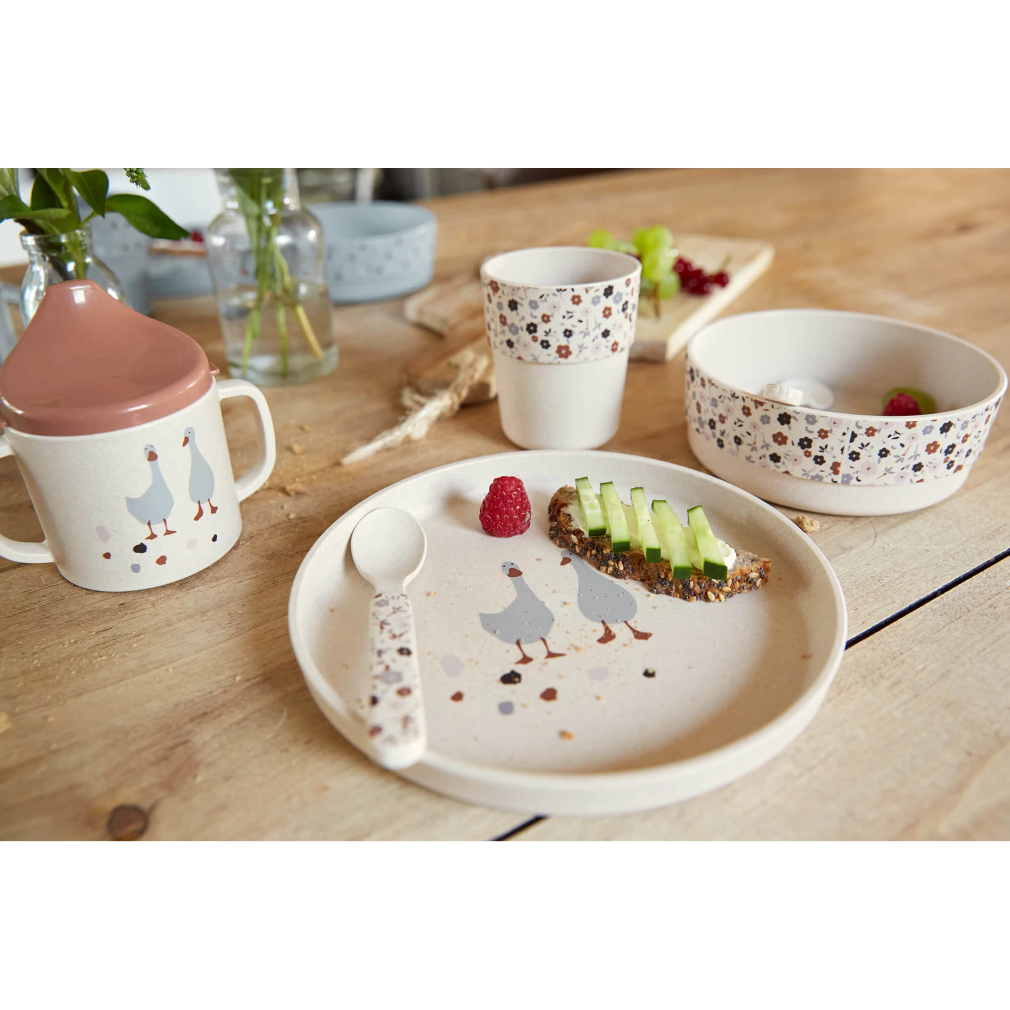 L’assiette, le bol, la tasse, la cuillère ainsi que la tasse d’apprentissage avec ses deux poignées et un bec verseur sont disponibles à l’unité.