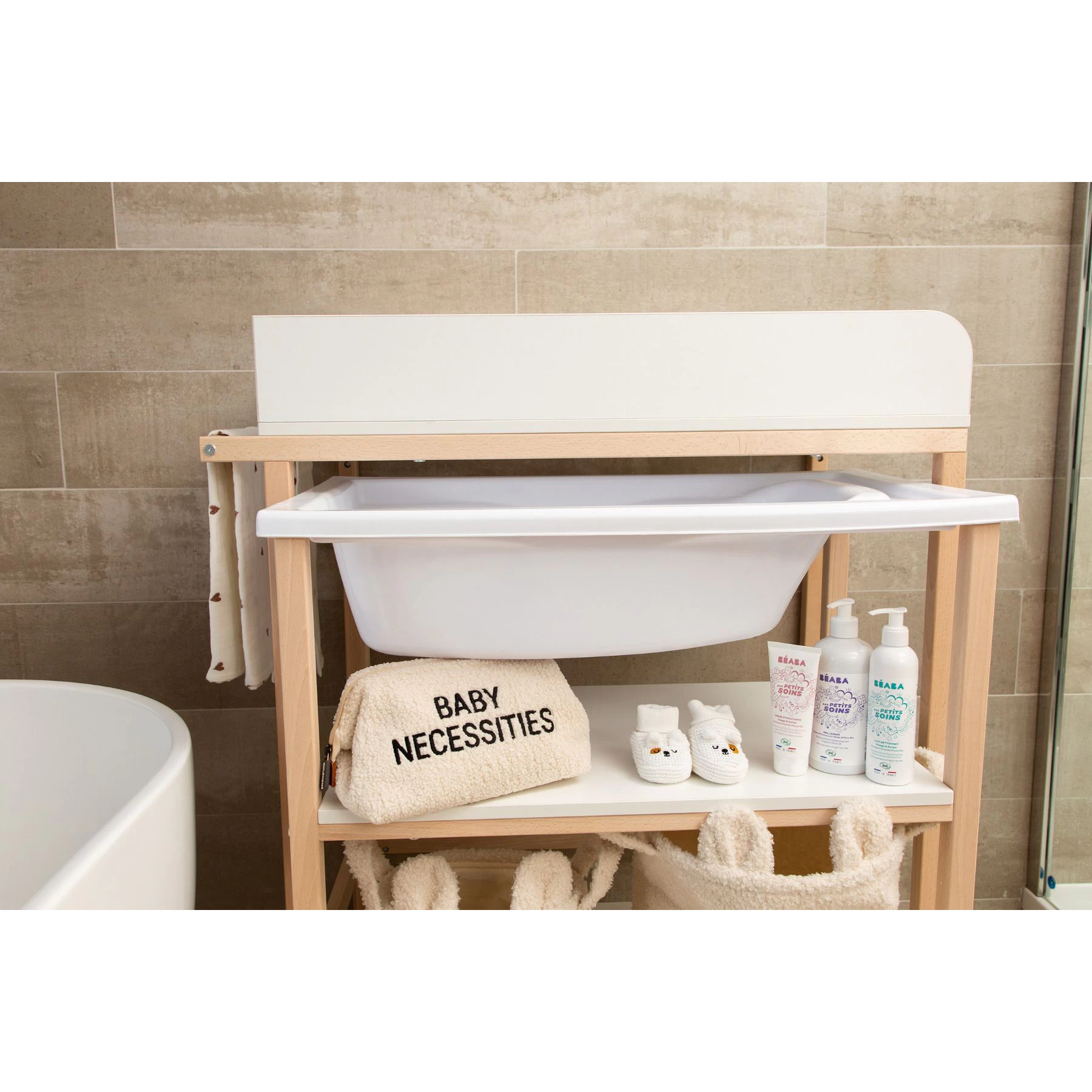Ce set de soins pratique se compose d’une table à langer en bois et d’une baignoire.