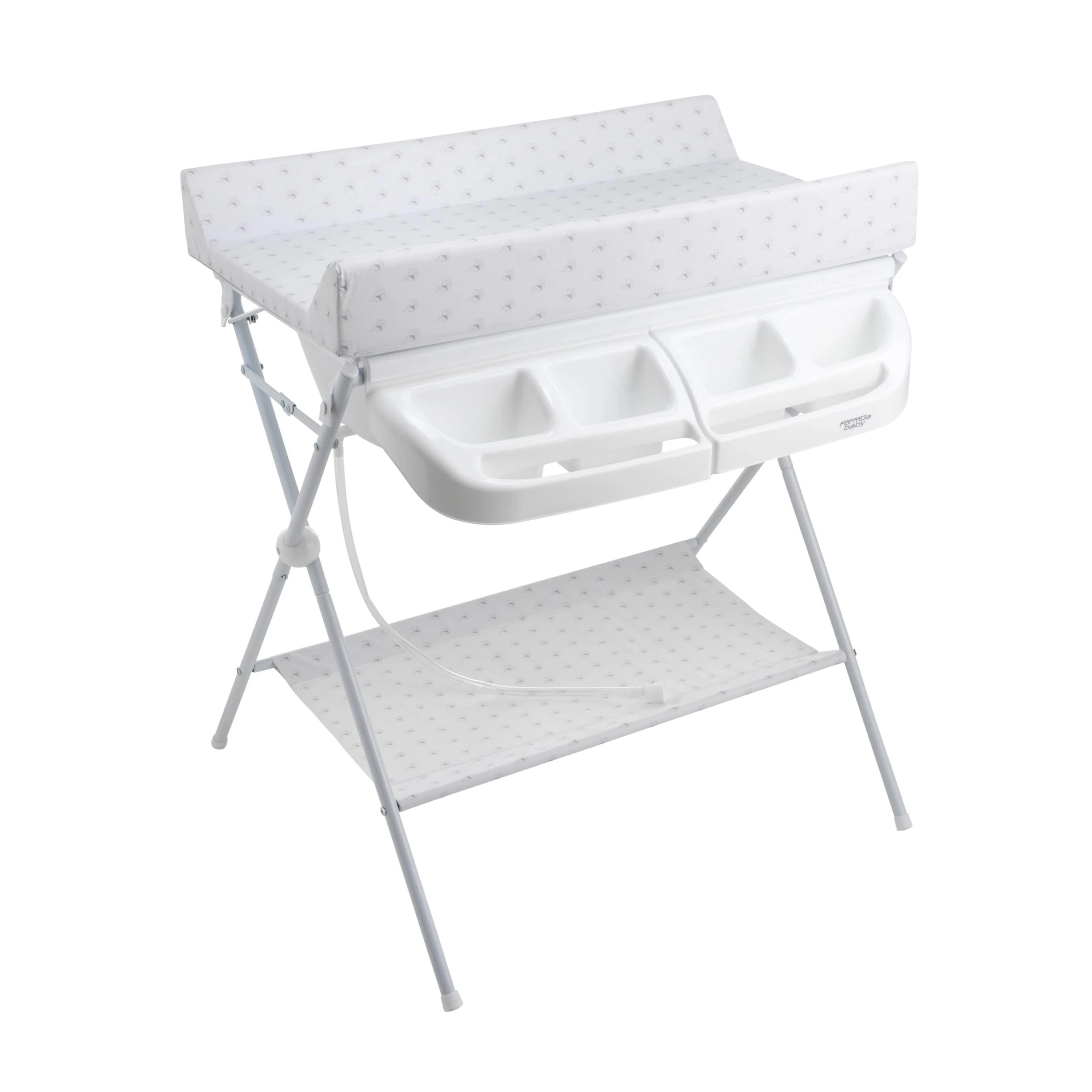 La table à langer pliante Formula Baby est utilisable de la naissance à 11 kg. Une fois que bébé n’en aura plus besoin, la baignoire intégrée ainsi que les paniers pourront être retirés pour plus de compacité lors du pliage. Table à langer avec baignoire et tuyaux de drainage, plan à langer pivotant et bac de rangement amovible